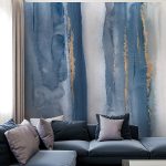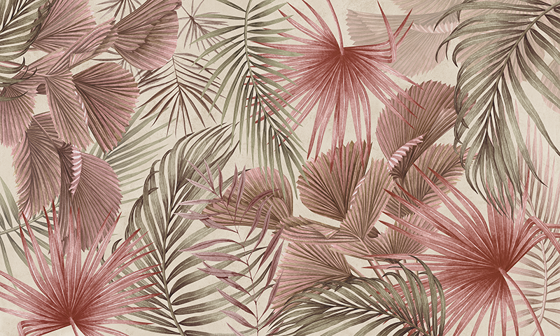 Enjoy the nice, cozy and fresh atmosphere that the Tropical Hygge wallpaper mural creates, like a tropical afternoon. For this jungle leaves wall mural, we tend to create the feeling of depth by layering leaves from different species of palm trees. The grungy background and also the different variations of vintage colours, green with burnt orange, green with purple and tones of blue or green, create a soothing ambiance that awaits you in your relaxation space, bedroom or living room after a stressful day. Match the Tropical Hygge wallpaper mural with modern, minimalist furnishing and let the result speak for itself.